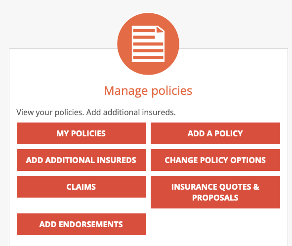 To do this, return to the main page of your account and select “Add Additional Insureds” under the Manage policies area of the screen.