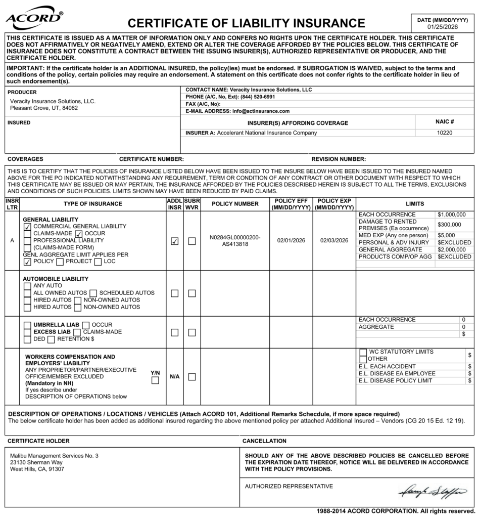 - A certificate listing Malibu Management Services No. 3 as an additional insured